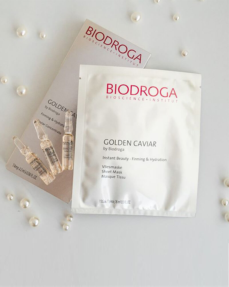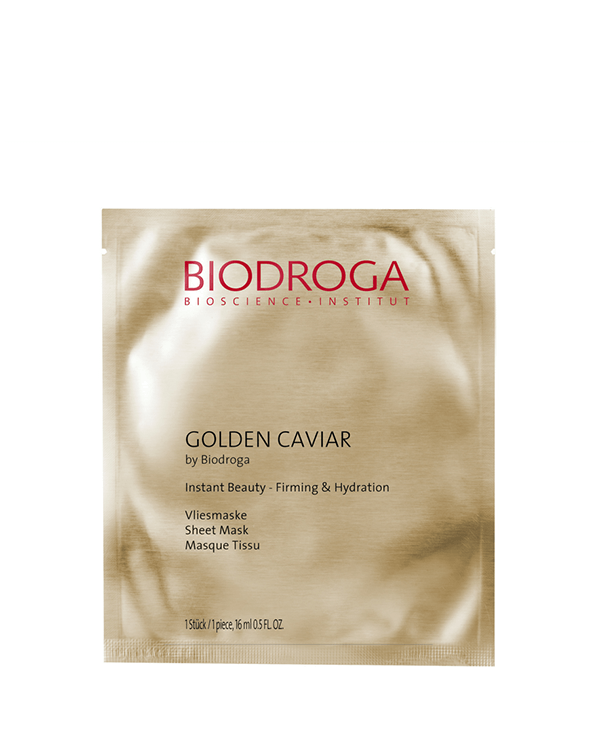 Biodroga Golden Caviar Sheet är en ansiktsbladmask, “sheet mask” som efter 10 minuter gör huden strålande och uppfräschad, samt minskar synen av fina linjer och torrhetslinjer. Fyller på hudens fuktdepåer.